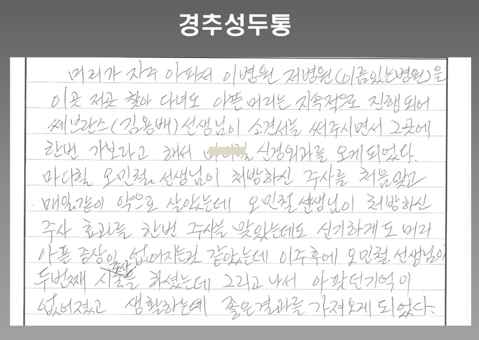 경추성두통 + 자율신경두통 프롤로치료 종종 일상 생활에서 경추성두통이나 자율신경두통으로 고통을 겪는 분들이 많습니다. 이 두 종류의 두통은 머리 뒤나 목