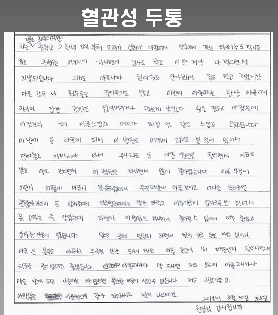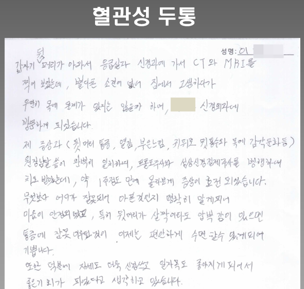 혈관성두통, 프롤로치료 + 성상신경차단술 혈관성두통(vascular headache)은 두통의 한 유형으로 혈관 문제로 인해 발생합니다. 혈관성두통은 혈관이 확장되거나 수축함에 따라 발생할 수
